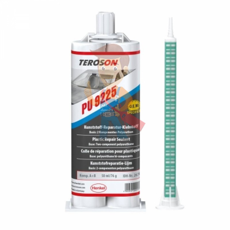 Teroson PU 9225/ Terokal 9225 – двухкомпонентный клей для ремонта пластика (в том числе бамперов автомобилей) на основе полиуретана, отверждается при комнатной температуре. Для ускорения полимеризации рекомендуется температура (60 - 70°C). Продукт упакован в практичные двойные картуши и отличается очень быстрой полимеризацией. При обработке Terokal-9225 настоятельно рекомендуется использование праймера Terokal-150. Для усиления (армирования) рекомендуется электролитический оцинкованный стальной лист.